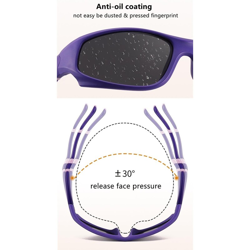 - The lens is made of impact-resistant polycarbonate material, which has excellent optical properties, can effectively block 100% of UVA and UVB rays, protect children's eyes from harm, and reduce visual fatigue. The lens has a special anti-glare treatment, polarized, which can effectively reduce glare and improve visual comfort.