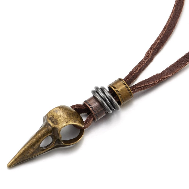 - Antique Bronze Eagle Bird Head Skull Pendant, Mens Leather Cord Necklace Brown, Tribal Gothic