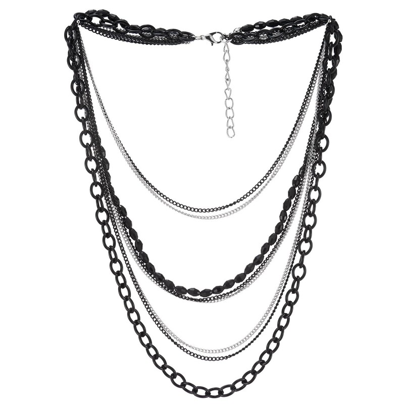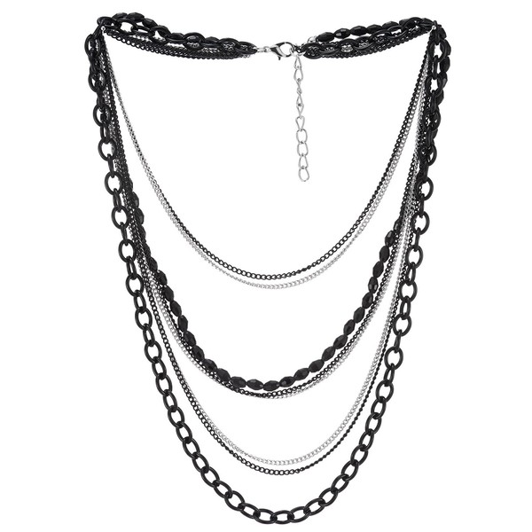 COOLSTEELANDBEYOND Choker Collar Statement Necklace Waterfall Multi-Strand Silver Black Chains Gem Stone Bead String