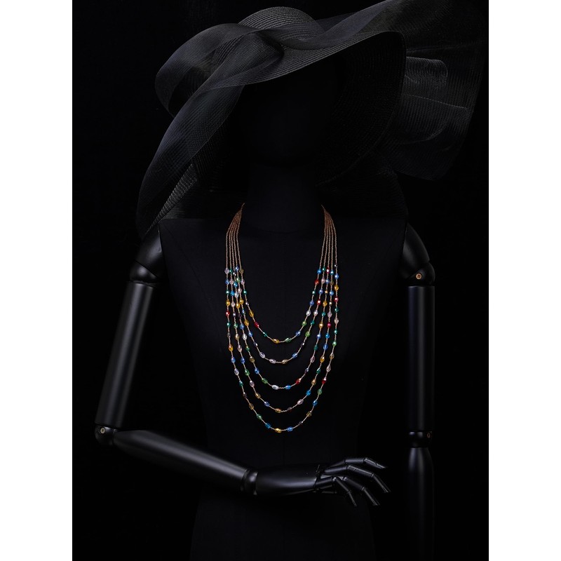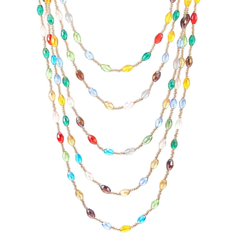 - Colorful Oval Beads Statement Necklace Multi-Strand Long Chains with Crystal Charm Pendant