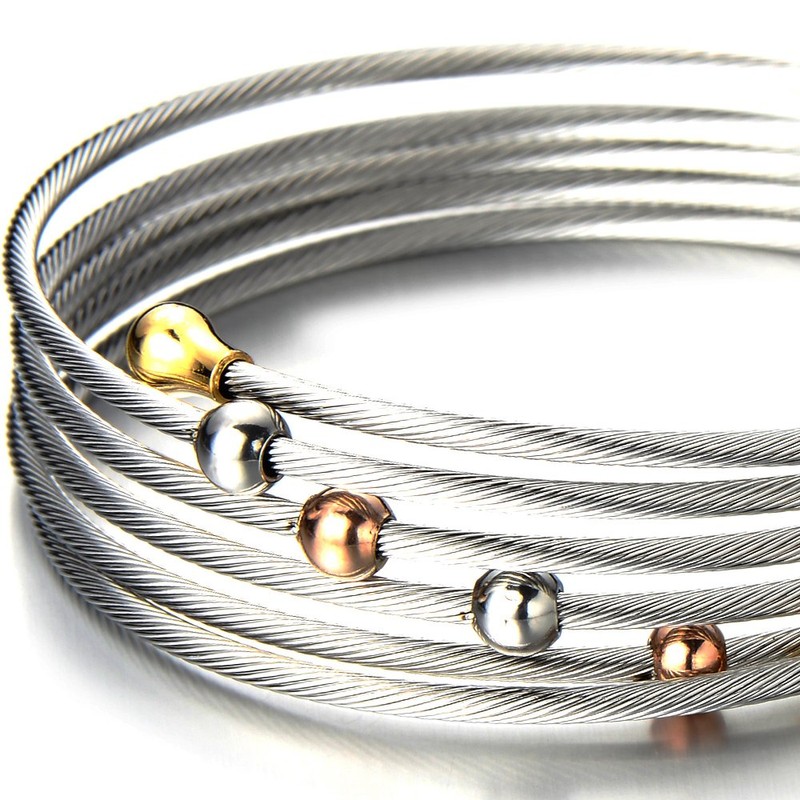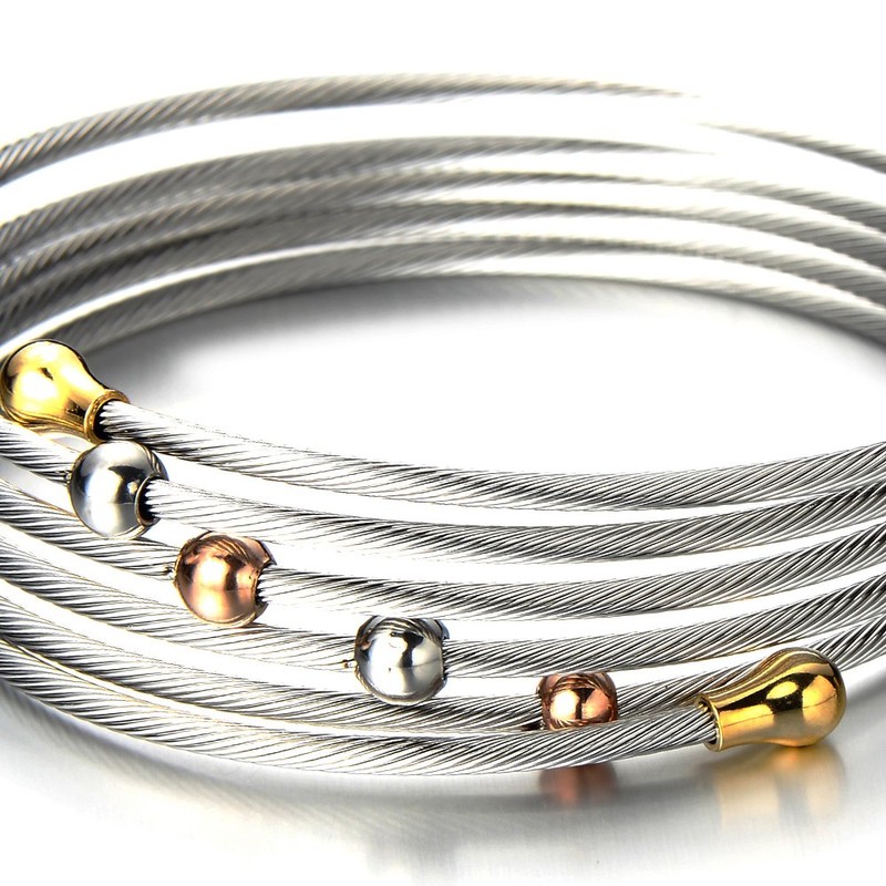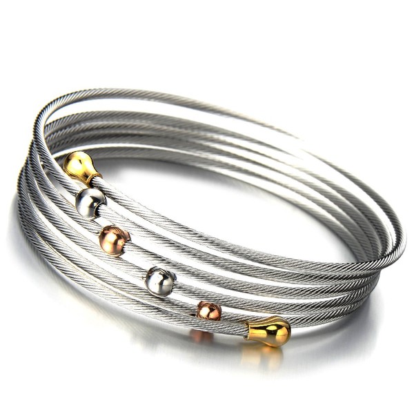 COOLSTEELANDBEYOND Elastic Adjustable Ladies Steel Twisted Cable Cuff Bangle Bracelet Elastic Multi-Lap Silver Gold Two-Tone
