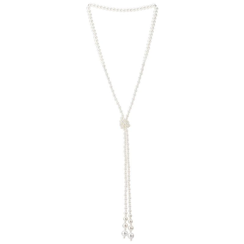 COOLSTEELANDBEYOND Elegant Long Pearl Lariat Chain Necklaces, Long Chain Y Shape Fringe Tassel Statement Necklaces Knot Design, No metal, No Gemstone