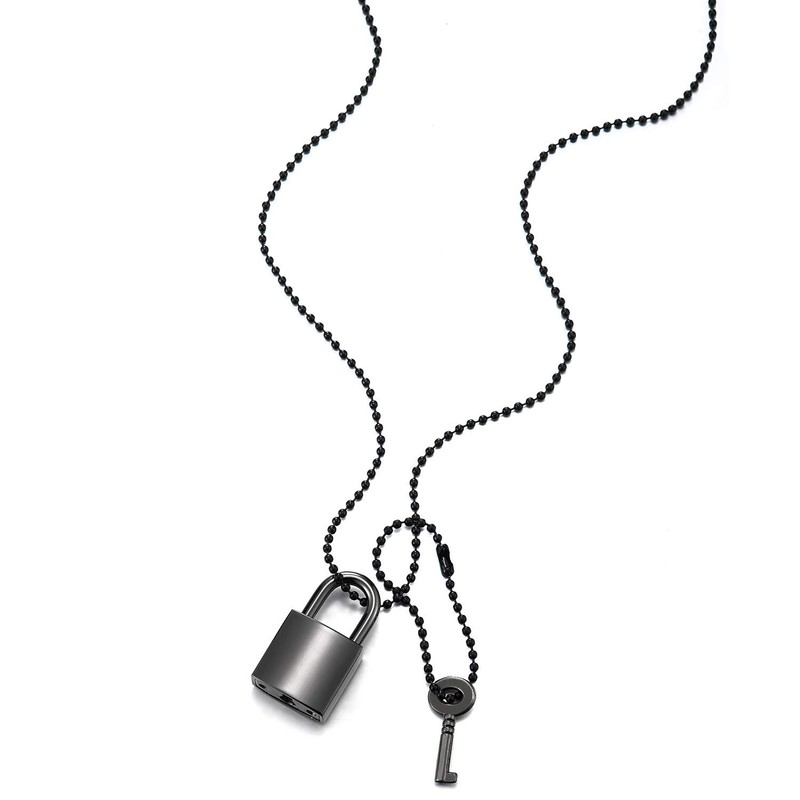 COOLSTEELANDBEYOND Grey Key and Lock Matching Set Pendant Necklace for Men Women, 28 Inches Black Ball Chain,, Metal, not-applicable