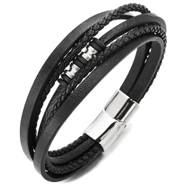 COOLSTEELANDBEYOND Mens Women Multi-Strand Black Braided Leather Bracelet Bangle with Steel Silver Bead Charms