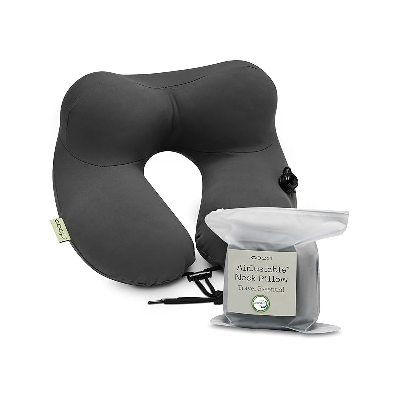 Coop Home Goods AirJustable Travel Neck Pillow, Inflatable, Adjustable Support for Neck & Chin, Compact Travel Pillow, Soft Memory Foam Comfort, Airplane Travel Essentials, Cooling & Washable Cover