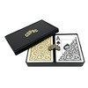 Trademark CopagT Poker Size Jumbo Index - 1546 Black'Gold Setup plastic playing cards are made from a exclusively engineered PVC plastic. This is a set of two poker sized decks. These cards can handle the wear and tear of normal games, outlasting paper cards up to 500 times. Completely washable, you don't need to worry about soiled cards. A quick wipe with a damp washcloth, then dry and they are ready to go. Each set comes in its own hard plastic case for storage. Whether you play solitaire, have a kitchen table game or manage a card room this set is the perfect match .These Index 100% plastic cards will last for years Poker sized (2.5 x 3.5 inches) 2 "4 Suit" design decks . Features: 100 % plastic cards Washable Hard plastic case Specifications: Overall Dimensions: 0.75" H x 3.44" W x 2.5" D Weight: 0.73 lbs