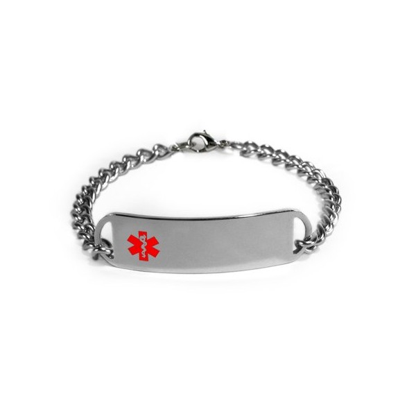 - The Medical Id Plate 1-5/8" x 1/2" is made from non-allergic, rust free stainless steel, polished to a mirror finish and curved for wrist wear.