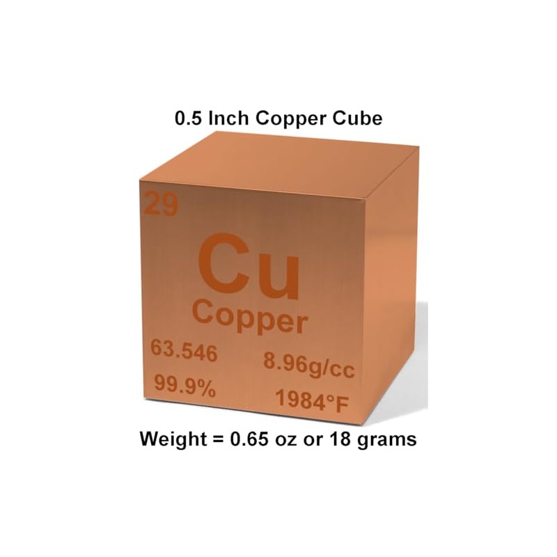 • Compact Heft: Weighing about 0.65 ounces (18 grams), this 0.5-inch cube demonstrates copper's substantial density in a small form.