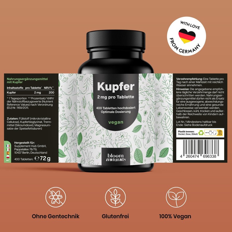 • HIGH QUALITY INGREDIENTS At Bloom Naturals we use copper bisglycinate known for its good tolerance. Our tablets are free from artificial flavours, preservatives and dyes.