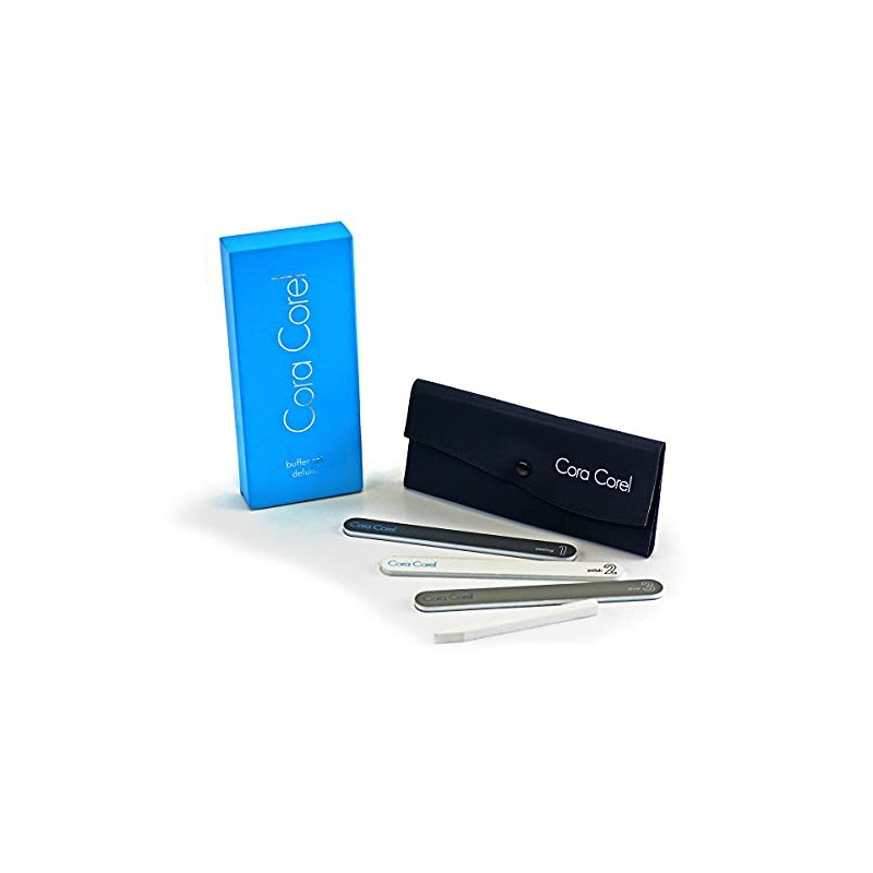 The Cora Corel nail care set consists of 1 crystal file, 1 exfoliating pad, 1 polishing pad and 1 gloss pad. Each cushion is 2.5 x 20 cm and is suitable for professional use. The kit has everything you need for a fast, professional nail care. The files are in an exclusive case, which is lined with velvet on the inside.