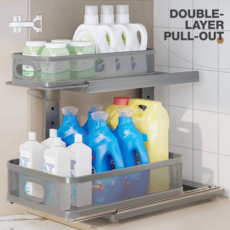 - 【2-Tier Pull Out,No More Strenuous Bending】Both upper and lower drawers glide out effortlessly, with no noise or jamming, giving easy access to items at the back of your cabinet without crouching or digging through clutter. Built-in stoppers prevent over-pulling, while suction cups at the base enhance stability for worry-free use.