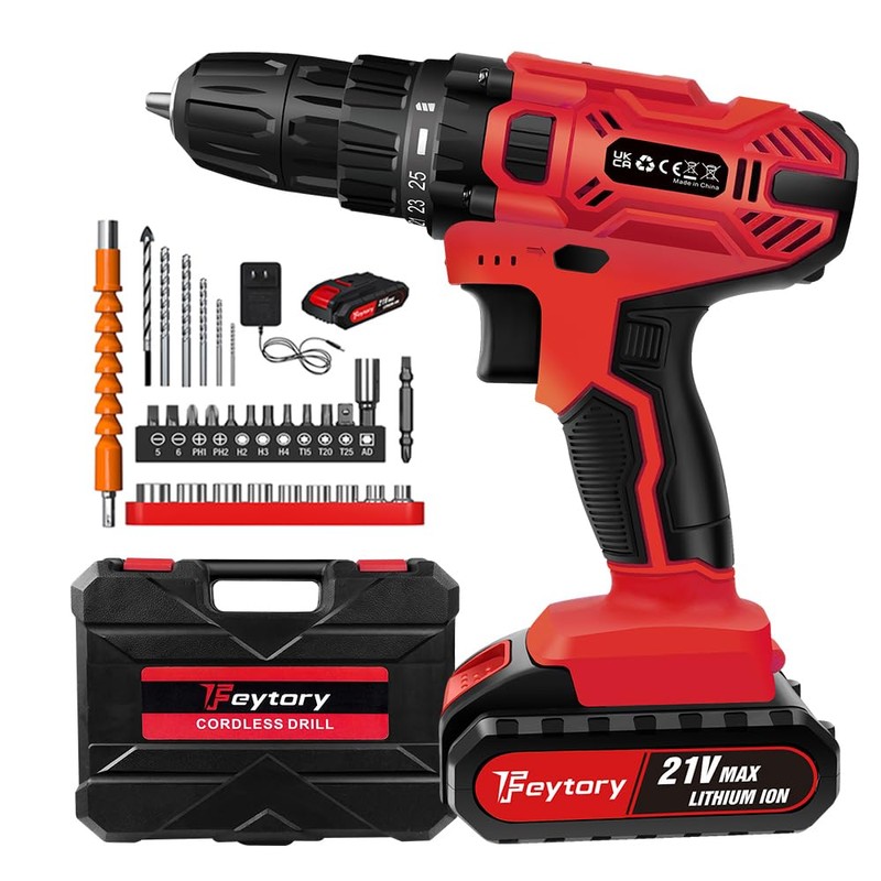 - 400 IN-LBS TORQUE & 25+1 TORQUE ADJUSTMEN - 21V cordless screwdriver set provides 400 In-lbs max torque and 25+1 torque setting giving you more accurate operation. So the combi drill can easily meet a wide range of needs for drilling and screwing in wood, plastic, metal or other materials. In addition, the forward and reverse levers that enable the drill to quickly switch between drilling and withdrawing of screws.