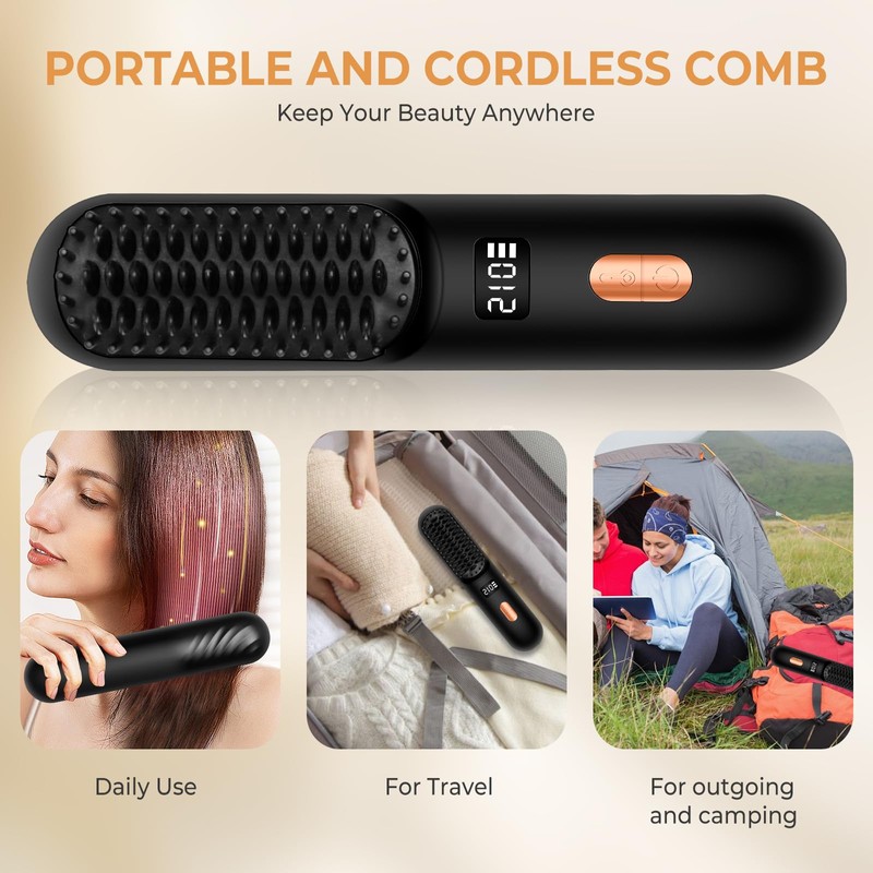 - Cordless Beard Straightener for Men Gift: The beard straightener brush also suitable for men to straightening their bear, make beard smooth and clear, The portable styler can evenly and fast heat up and provides tangle-free natural curls with frizz. No need to cool down after using the hair brush straightener, just put the it on the desktop and don't need to worry about burning desktop. Because the handle of the cordless hair straightener has a certain radian to avoid direct contact with the desktop.