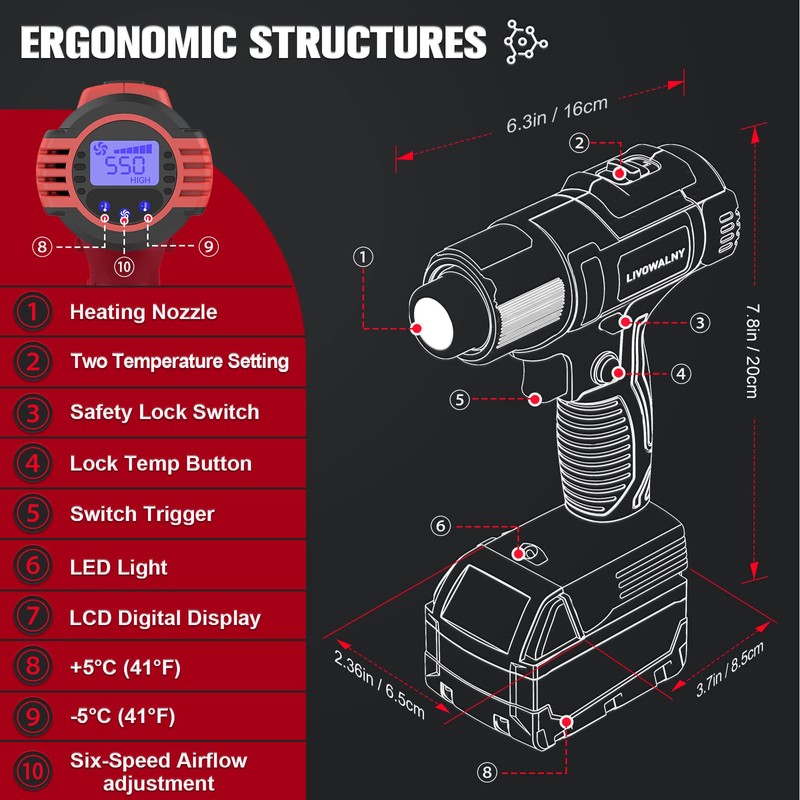 - 【Variable Temp Control & Overload Protection】——350W hot air gun provides strong power in two modes: I: 50-300℃(122-572°F), II: 300-550℃(572-1022°F). Six airflow speeds: I: 100-180L/min, II: 220-280L/min (Max air flow of 9.9CFM). Additionally, its overheat protection feature automatically shuts off the heat gun if it exceeds a safe operating temperature, ensuring long-term durability and safety.