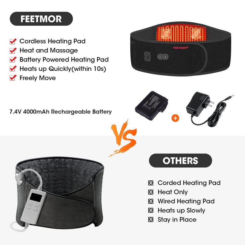 - 【Cordless Heating Pad 】The heated back pain relief with battery contains excellent heating elements and 2 massage motors, no matter where you put them on your waist, back or legs, heat belt for back pain relief can bring you very comfortable enjoyment. Cordless heating pads for back has a good effect on people suffering from arthritis, poor blood circulation and joint stiffness. Very suitable for family, travel and office. The size of the back pain relief belt is 48 inches