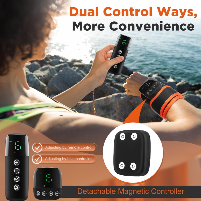 Cordless Heating Pad Wrap, Portable Training Massaging Pad with Detachable Controller to Adjust 8 Massaging Modes and 2 Heating Levels, Comes with Remote Control, Suitable for Neck Wrist Arm Calf