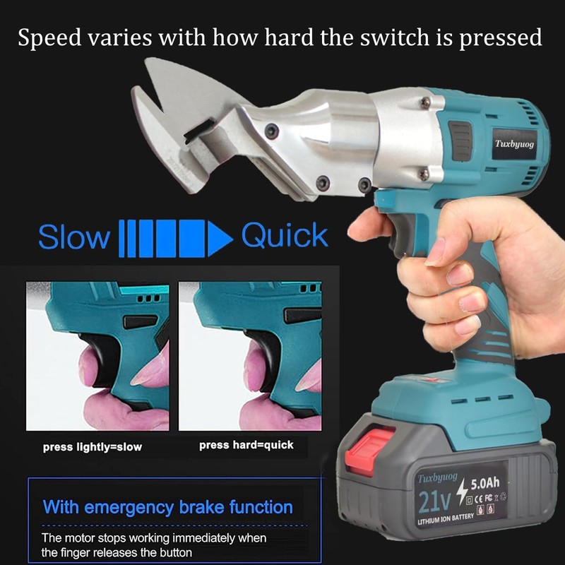 - High-capacity Battery: The electric metal cutting shear comes with 5000mAh battery, equipped with a fast battery charger, it can increase your work efficiency.