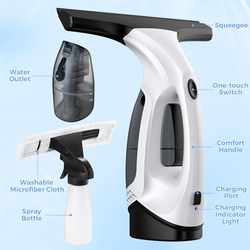 - Cleaning Tips:First mist the surface by using the included spray bottle, then wipe away dirt and stains with the microfiber pad attached to the spray bottle, and finish by vacuuming up the dirty water with the window vac without any streaks or drips left.