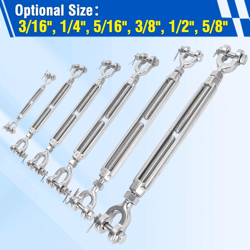 - Wide Application: Jaw turnbuckles can be used for shrinking and tensioning ropes, which is widely used in steel wire, pulling ropes, shade sails, righting trees, ground anchors, construction or DIY projects. A great way to secure chains, cables, or ropes, stretch a fence, zipline, clotheslines, shade sail, deck railings, string lights, sunshade, batting cage, dog run and other tensioning projects