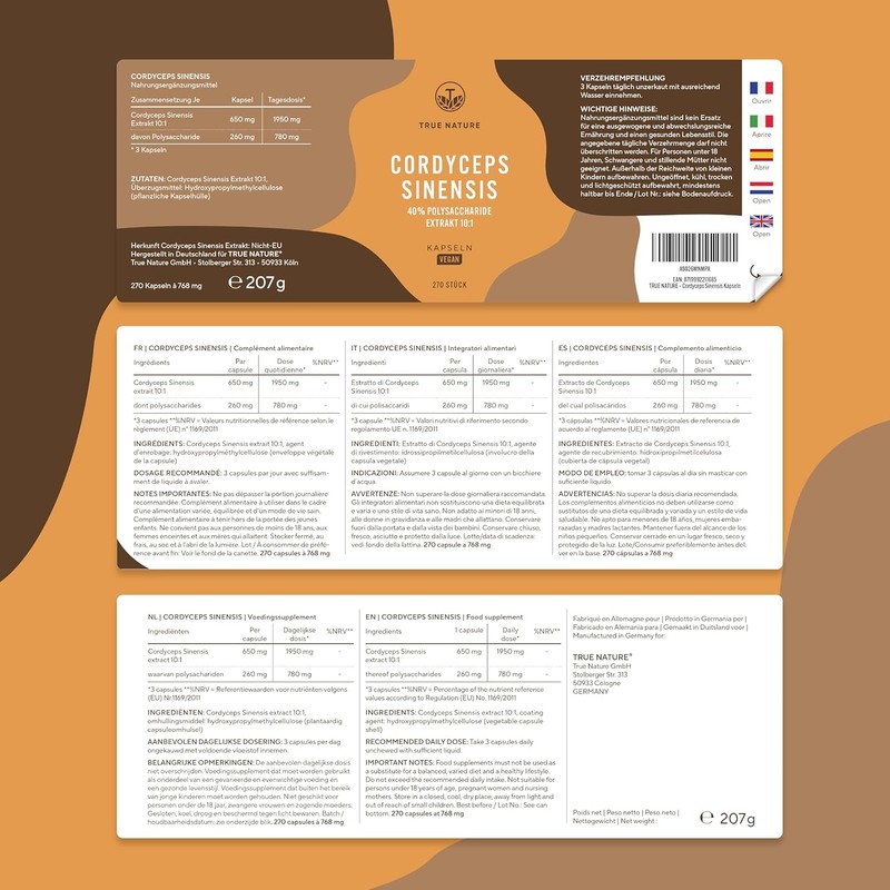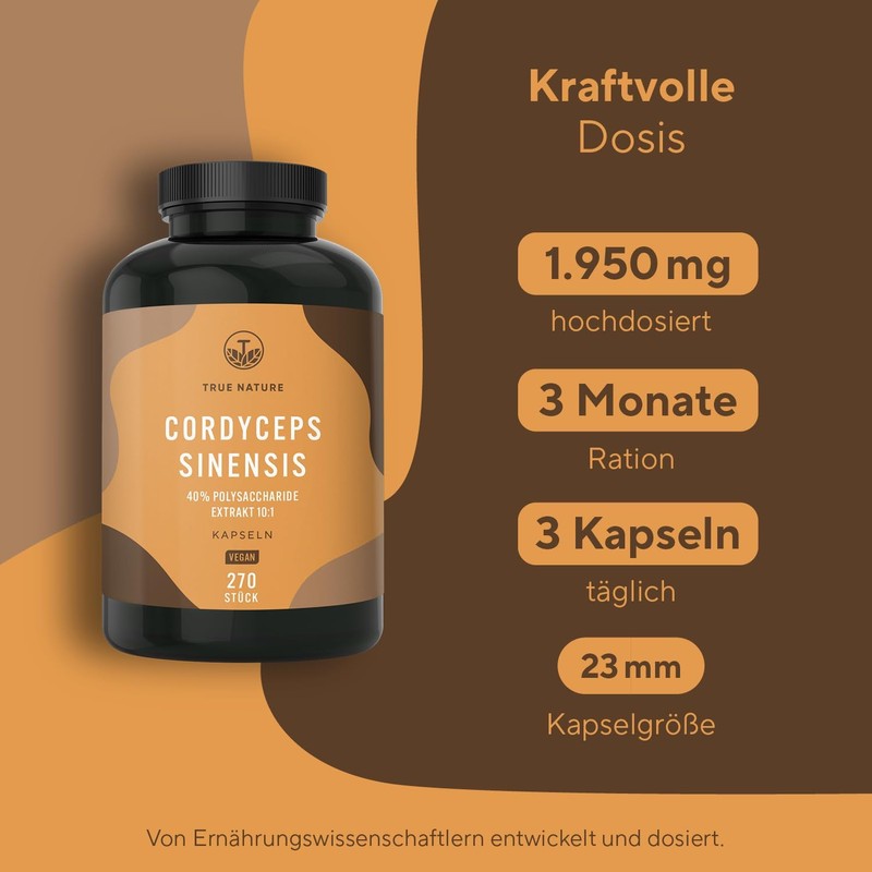 • XXL pack – the 270 Cordyceps capsules are enough for 3 months, with daily intake. A daily serving of 3 capsules contains 1,950mg of pure Cordyceps. So you are ideally cared for.