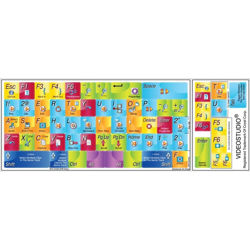 - Keyboard Sticker Shortcut for Corel VideoStudio are laminated and made with typographical method on high-quality Matt Vinyl using non-toxic materials. Thickness - 80mkn. Made in USA.