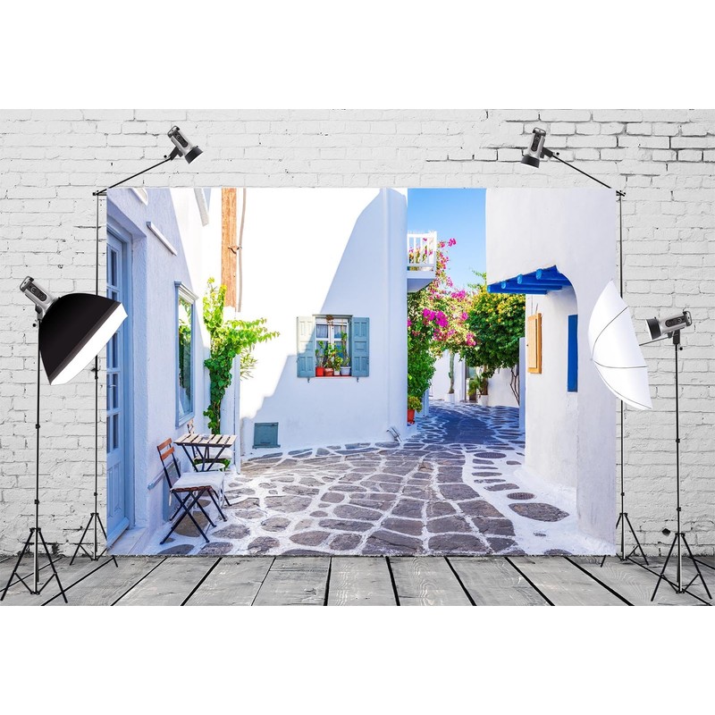 CORFOTO 7x5ft Fabric Greece Backdrop for Photography Famous Greek Island Whitewashed Dotted Alley Old Town Street Background for Europe Themed Party Decor Birthday Wedding Photo Studio Props