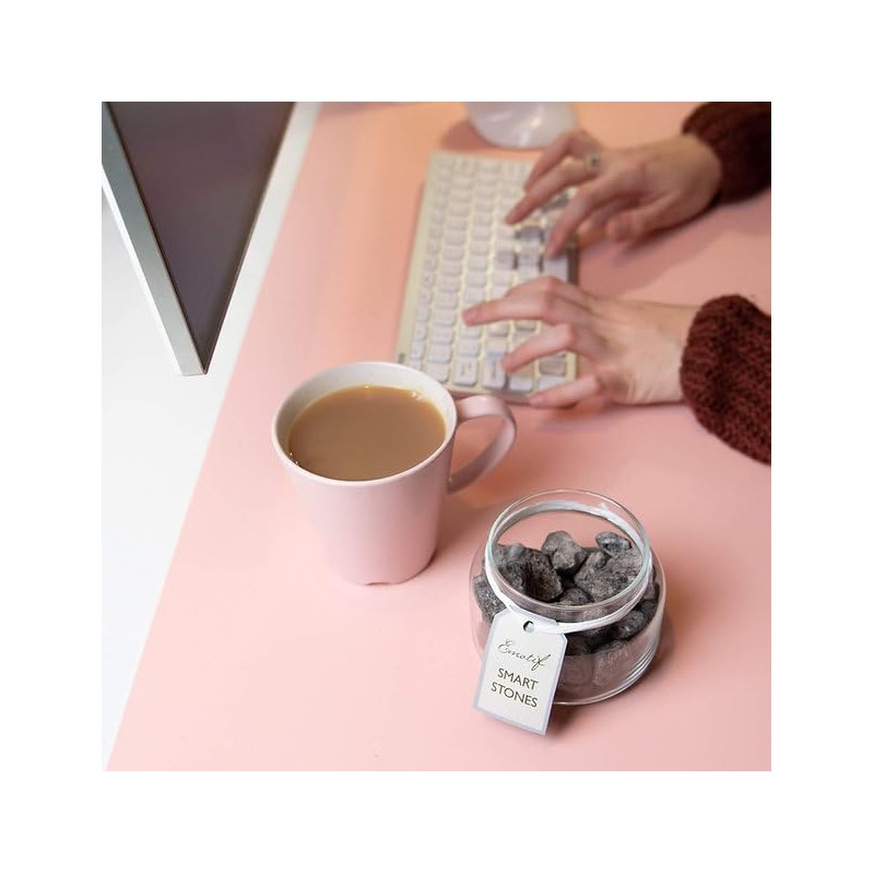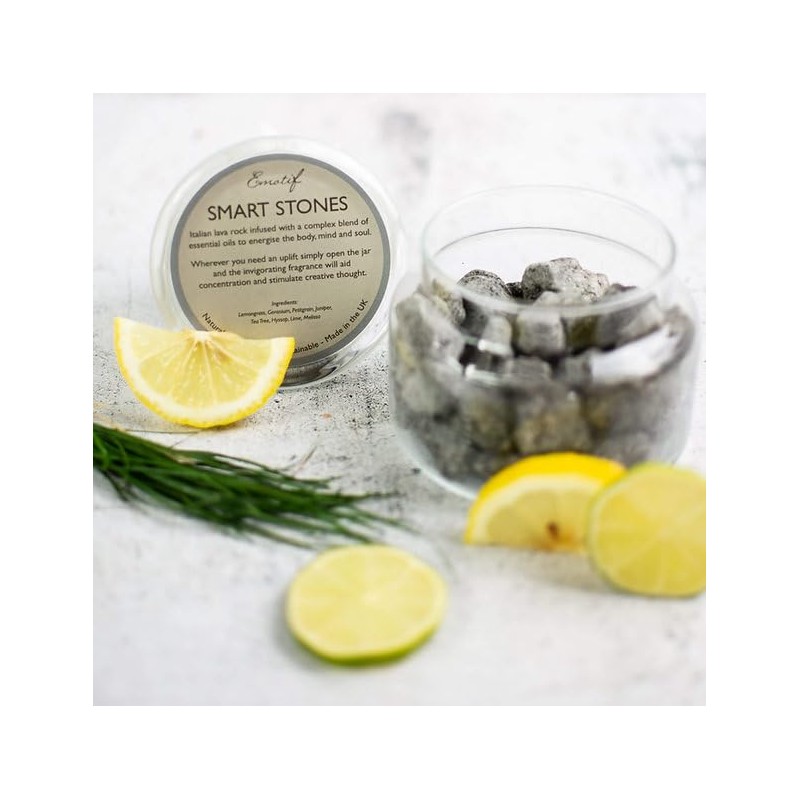 Need a natural way to stay alert focused and energised? The Smart Stones are your new must-have! Infused with a powerful blend of 8 essential oils these stylish volcanic stones are designed to stimulate the senses and awaken your mind whenever you need a boost.Handmade in East Sussex this 100% natural vegan and cruelty-free aromatherapy set comes in a contemporary glass jar perfect for any home office, work or study space. Whether you're struggling with a deadline, revising for exams or just feeling sluggish simply remove the lid, take a deep breath and let the revitalising scent refresh your body and mind.The stones arrive pre-infused and will stay fragrant for months but don't worryour Smart Stones refresher oil allows you to easily top up the scent by adding a capful or two every few weeks. With sustainability at the core the stones and jar can be refreshed for years to come.No synthetic fragrances just pure natural energy in a jar.With its cool natural rock presentation this set isn't just practicalit's also a beautiful gift for students, professionals or anyone looking for a stylish natural way to boost focus and productivity.Say hello to a fresher sharper youone breath at a time!Contains essential oils of Lemongrass Geranium Petitgrain Juniper Tea Tree Hyssop Lime and Melisa.