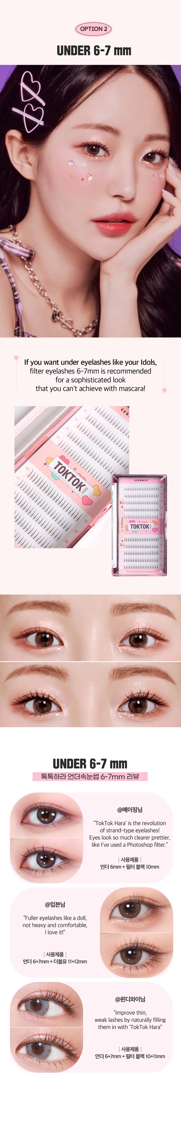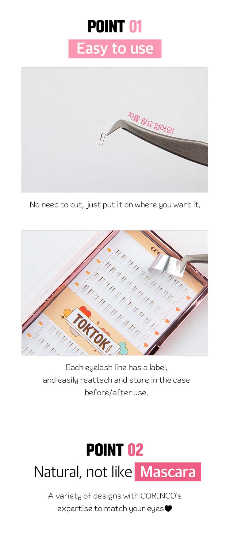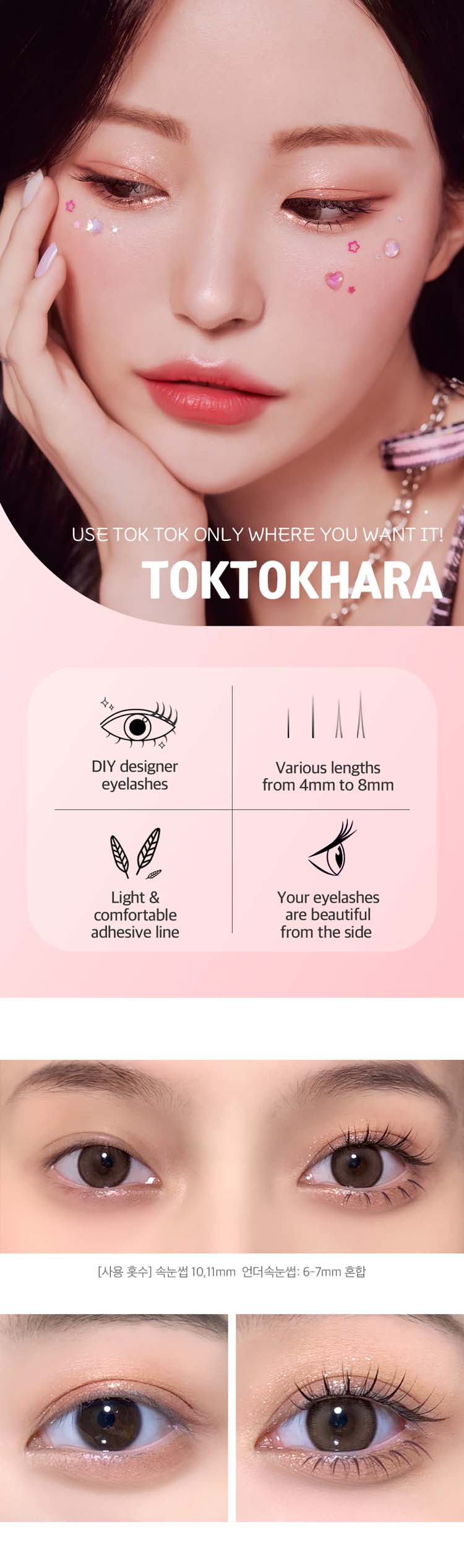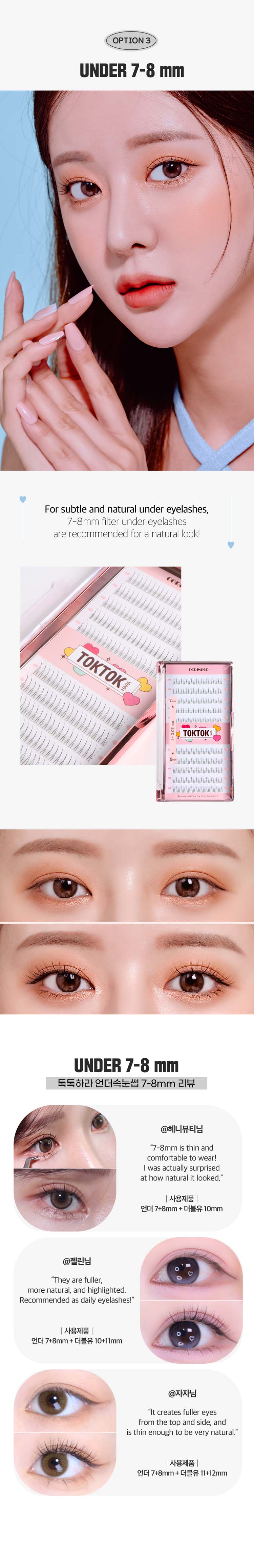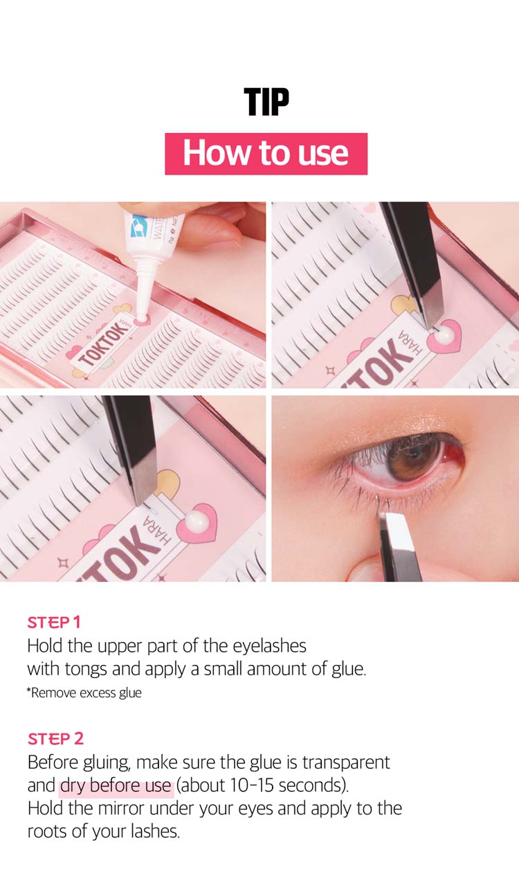1. Apply the eyelash glue on the eyelashes placed inside the Tok Tok case. (Do not remove the eyelashes in advance) 2. After the solution becomes transparently dry (after 10~15 seconds), pick the upper part of the eyelashes with tweezers and remove them from the case. 3. After applying the curler and mascara, place the mirror below your eyes and dab it on the roots of your eyelashes. (It is recommended to stick them from the center of the eye to the ends in order.) 4. Please add 2~3 lashes in the front corner of the eyes. *This product does not include eyelash glue. Purchasing glue and tweezers separately is recommended. *You cannot use extension glue with regular false eyelashes. We recommend removing all the eyelashes with a lip and eye remover before washing your face. *Wet a cotton with the lip and eye remover, and apply for 5~15 seconds to cleanly remove the contents. The manufacturing process is all done by hand, so there may be slight differences in size.