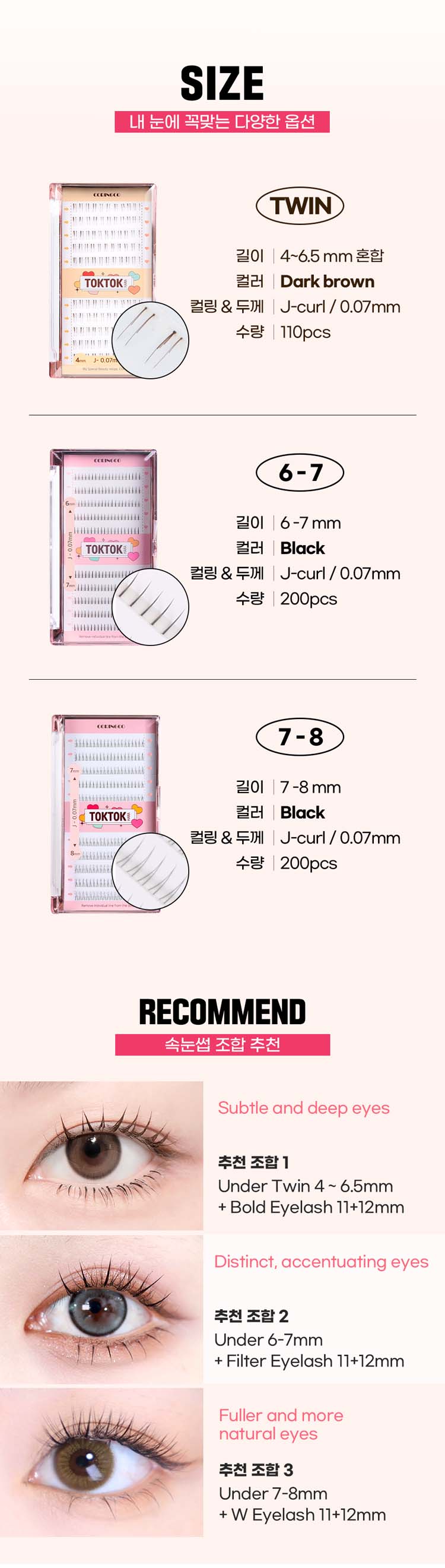 Glue spreads even more thinly and has a weightless feel to the eyelashes, with a dispersed weight, making it twice as comfortable and twice as strong. A seamless product with no heavy lines. Design the eyelashes according to your taste. The bristles have a sharp edge. Has a light and comfortable adhesive line. Express a pure look without the eyeliner. Comes in various lengths from 9mm~12mm. Tok Tok is made with only single thread size, not unnecessary multiple mixed sizes, making it possible to use all 100pcs of large-volume eyelashes 100%. As it is a product that directly touches sensitive eyes, we check the safety, and it is a safe eyelash that has passed national certification agency verification. According to black reviews, the eyelashes are not too thick, so they are not burdensome and are light, so they stick easily with a small amount of glue, they look great in pictures and are seamless even on daily makeup, is possible to produce doll-like eyelashes, and the filter eyelashes fill in blank eyelashes even if there are no under eyelashes. Each lash is handmade for the increases seamless look. Recommended for those who want to give points only to the part they want to match their eyes, those who want to give points on special days, those who want to produce delicate individual eyelashes one by one, those who felt stuffy or incompatible when attaching eyelashes, those who want to easily attach eyelashes even without skill, and those who are looking for safe eyelashes that are reliable. According to brown review, it sticks seamlessly with a not too bright chocolate color, it is not difficult to apply, and it is an eyelash that gives a clear point to the eyelashes, recommended for those who prefer brown makeup. Recommended for those when your eyelashes are not satisfied with any eyelash extensions because they are partially missing, when you want to make them longer and more voluminous because they are too short and sparse, when you want volume because your eyelashes are weak, when you need a refill because the eyelash extension received from the shop is falling off in many places, when it is difficult to attach individual eyelashes because of discomfort.