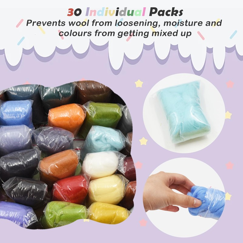 - COLORFUL Our starter wool roving kits come in 30 different colors, each weighing 10 grams. From classic black to iridescent colours, there is something for everyone, and you can let your imagination run wild by felting your creations in a variety of colours with the needle, wet felting and spinning