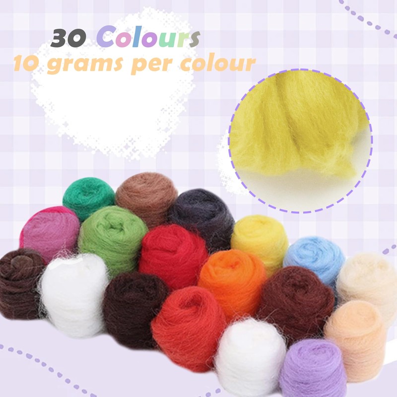 - 30 Assorted Colour Felting Wool: This wool set contains 30 colours weighing 10 grams each to suit your colour needs. The lighter colours are better suited for felting small animals and the darker colours for felting plants. You can mix the colours as you like to create your own unique colours and enjoy wool felting, needle felting, dry and wet felting, spinning, knitting, decorating and other wool felting work