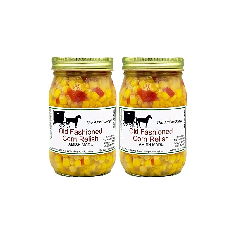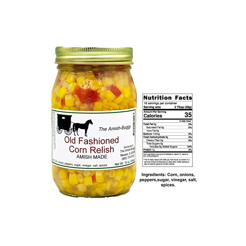 Corn Relish As Only The Amish Can Make It. 16 Oz Jar Ing: Corn, onions, peppers, sugar, vinegar, salt, spices.