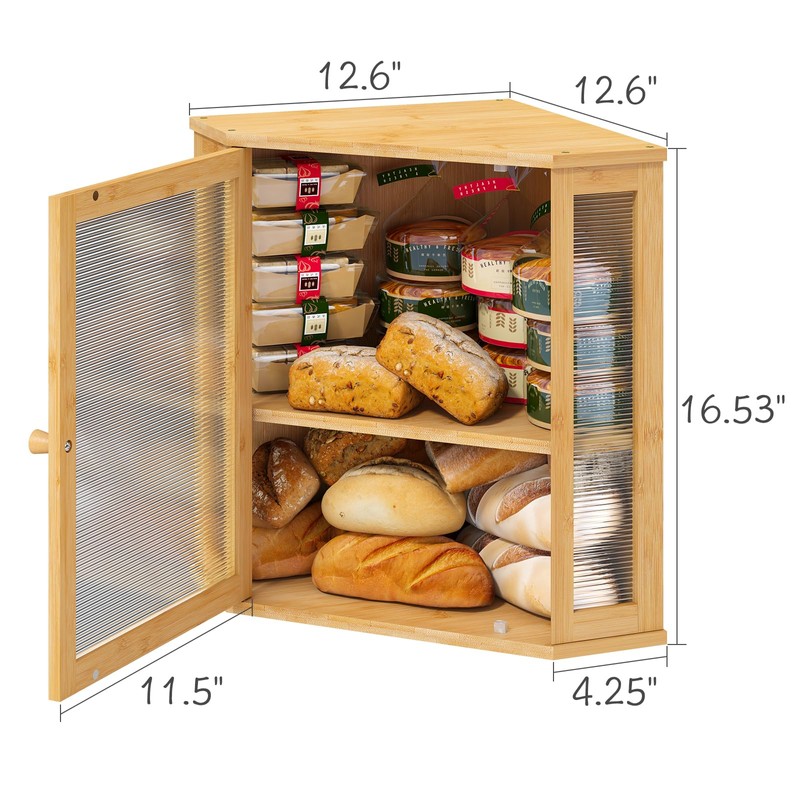 viewcare Corner Bread Box for Kitchen Counter, Bamboo Wood Large Capacity Bread Storage Bin with Acrylic Wavy Door Panel (Natural, Extra Large)