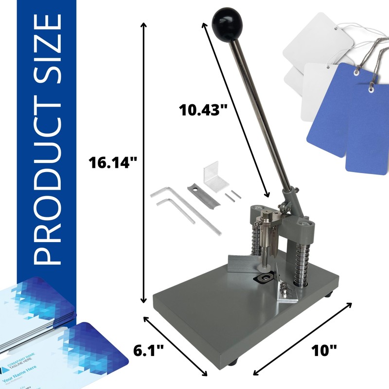 - Dimensions of this metal corner punch: The height is 16.14”, the base is 16.1”x10”; handle length is 10.43”. The cast iron base keeps the punch paper cutter stable on the table, metal baffles can be adjusted to form the right angle. Equipped with a metal round corner punch, this round corner machine guarantees accurate cuts every time