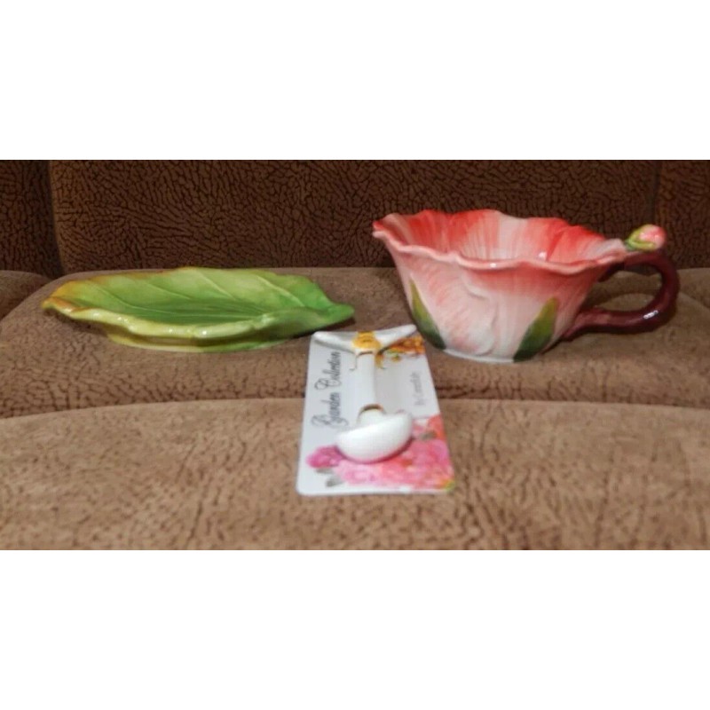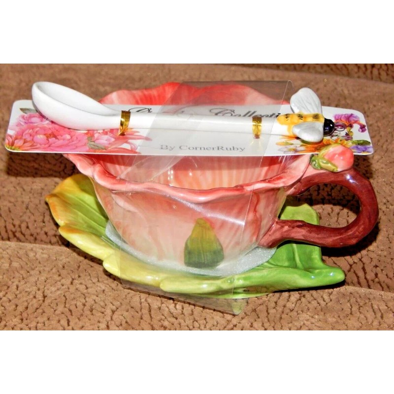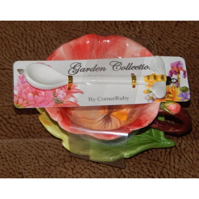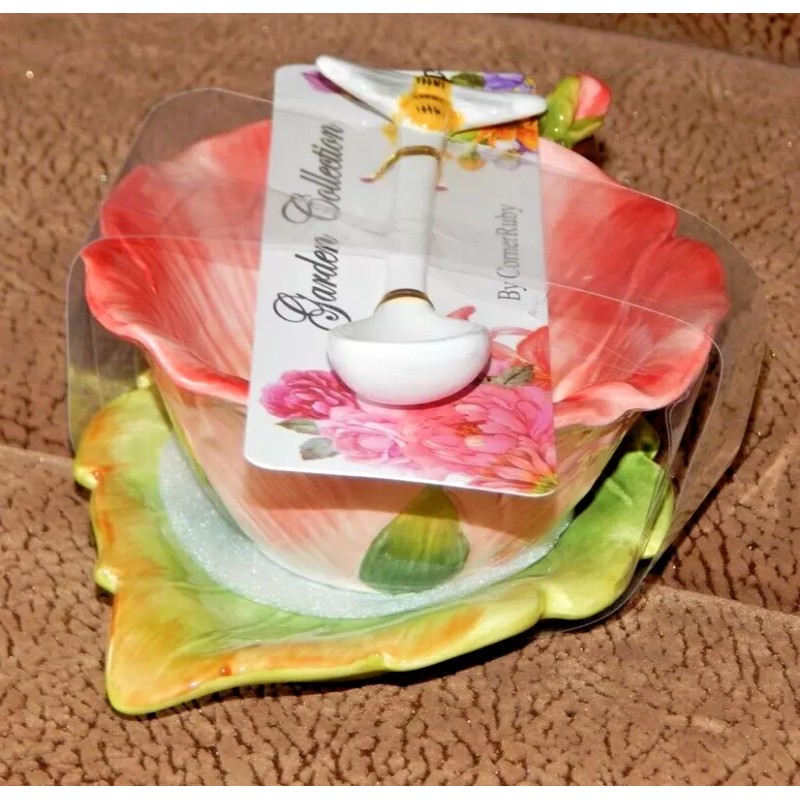 Corner Ruby Garden Collection Salmon Pink Flower Teacup Leaf Saucer & Spoon NWT