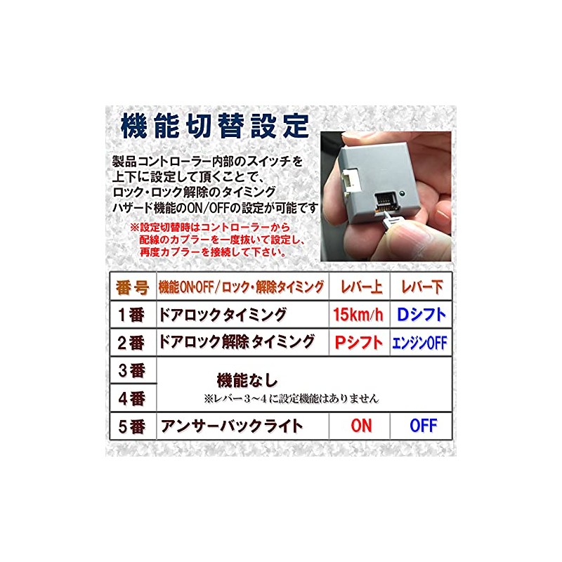 • 1. Door lock with D shift even at speeds of 12 km/h - 18 km/h. Manual shift cars cannot be used with "door lock with D shift". Set the car speed lock