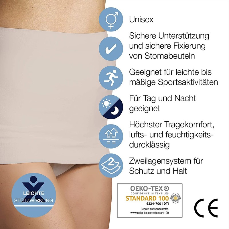 Looking for the perfect Light Support for your Ostomy or Hernia? Does not contain latex - 91% Polyamid 9% Elastane Washable Tested for harmful substances according to Oeko-Tex standard 100 QUIET DISCRETION The privacy you deserve.Pouch-cover function that helps reduce content noise from pouchProvides extra security during physical activity STOMASAFE PLUS IS YOUR SOLUTION! KEEP YOUR ACTIVE LIFESTYLE Safely fixates the Ostomy pouch, so you feel securePerfect for light to moderate sports activitiesWearable day and nightSuitable for both 1- and 2-piece systemsMeant for Light Support Level- See our other options for higher levels UNPARALLELED COMFORT Seamless design for optimum skin friendliness. Smooth and supportive fitTwo-layer system for no contact between skin and pouchDesigned in soft microfiber to ensure highest possible comfort and the material is air and moisture permeable, so that it keeps the skin dry and allows the skin to breathe Read more LIGHT SUPPORT - STOMASAFE CLASSIC/PLUS Light Support garments are designed for fixation and light support of stoma pouch only (no hernia management/prevention). Can be worn day and nightProvide discretion by creating a smooth appearance and are very useful when carrying out daily activitiesSoft, breathable and flexible material for optimum comfort MEDIUM SUPPORT - CORSINEL UNDERWEAR Medium Support garments are designed for additional fixation and support of the stoma pouch or for hernia management/prevention.