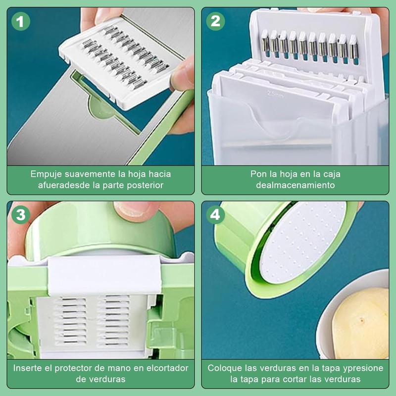 Lista: 5* cuchillas, 1* protector de mano, 1* cuerpo cortador de verduras