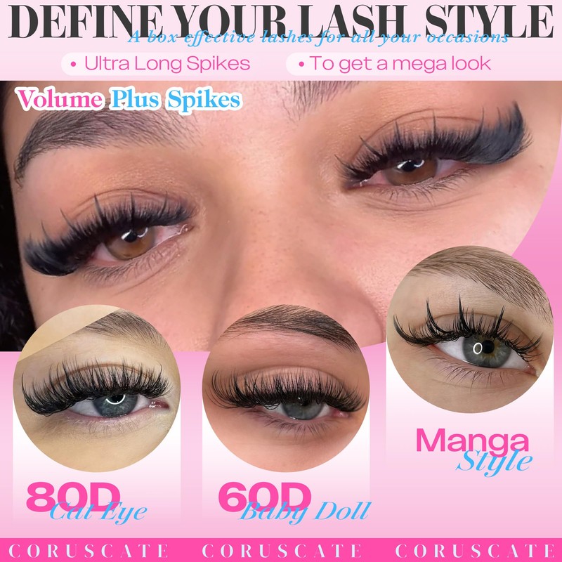 - SPIKE EYELASH CLUSTERS WITH VOLUME: Beauty requires wispy volume and spike lash clusters, so why not combine the two lash styles we designed for this kit—60D+80D volume lash and a manga lash spike? Cluster eyelash extensions give you an eye catching attractive look, highlight your makeup, and keep you looking amazing all day; They are ideal for those who desire thick lash extension and a mega style
