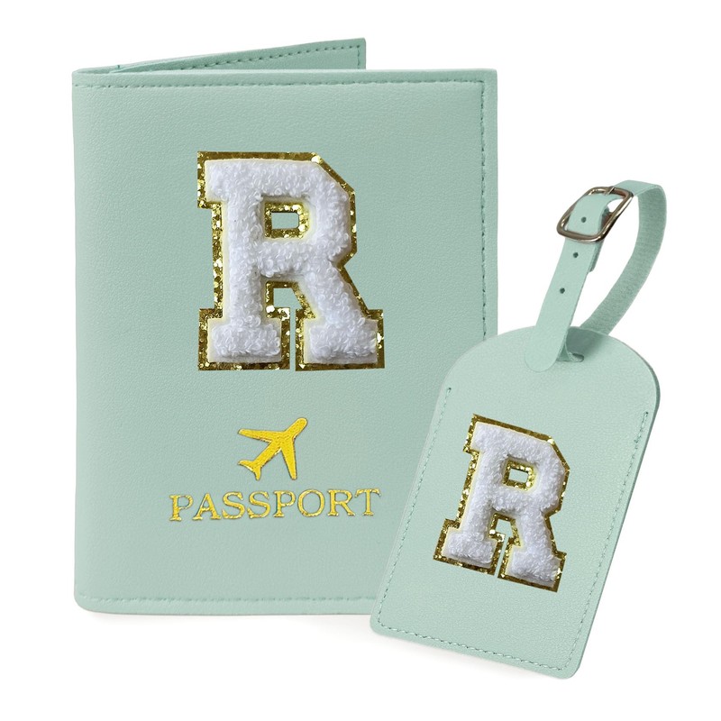 - 2 Pcs Initial Passport Cover and Luggage tag Set: Two pieces of Green passport holder and luggage tag bulk with preppy white chenille letter patch R.