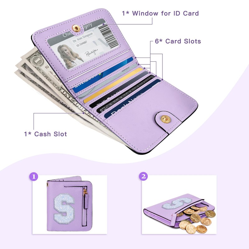 - [Credit Cards ID Card Cash Money Holder Coin Change Zipper Wallet suitable for Everyday Use] 6 slots for credit cards/banking cards easy to access, 1 zipper coin pocket, 1 cash compartment, 1 window for citizen ID card/family photo/drivers license, the compact purple wallet with buckle closure suitable for daily use.