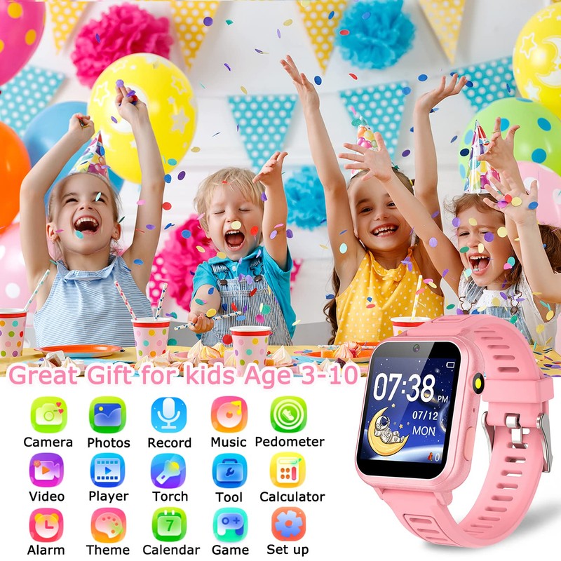 - 【Magic Selfie-Camera/Video】Kids smart watch is equipped with camera. Children can take photos and record videos, capture record every joyful moment in their lives. With pop big head sticker shooting, children can take some hilarious photos with family or friends.