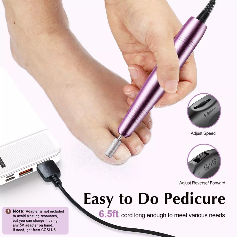 - Note: This electric nail drill needs to be connected to a power source. It comes with a 6.5ft longer control cable, which is more convenient to use. Adapter is not included to avoid wasting resources, but you can charge it using any 5V adapter on hand. If need, get from COSLUS.