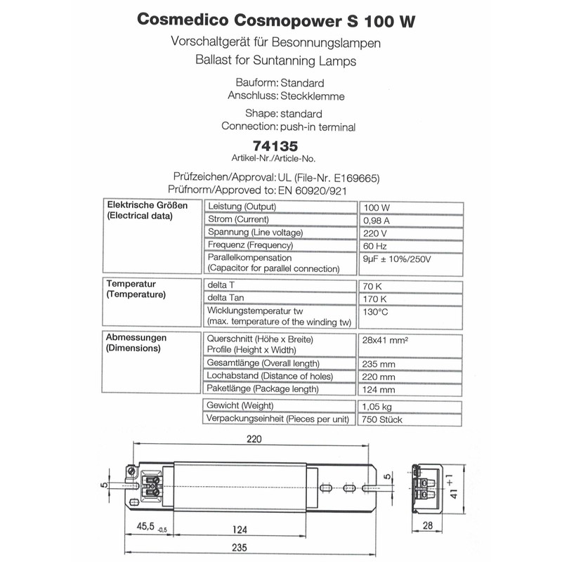 CosmoPower S 100W Choke Ballast - 220V - 60 Hz - Tanning Lamp Ballast #74135