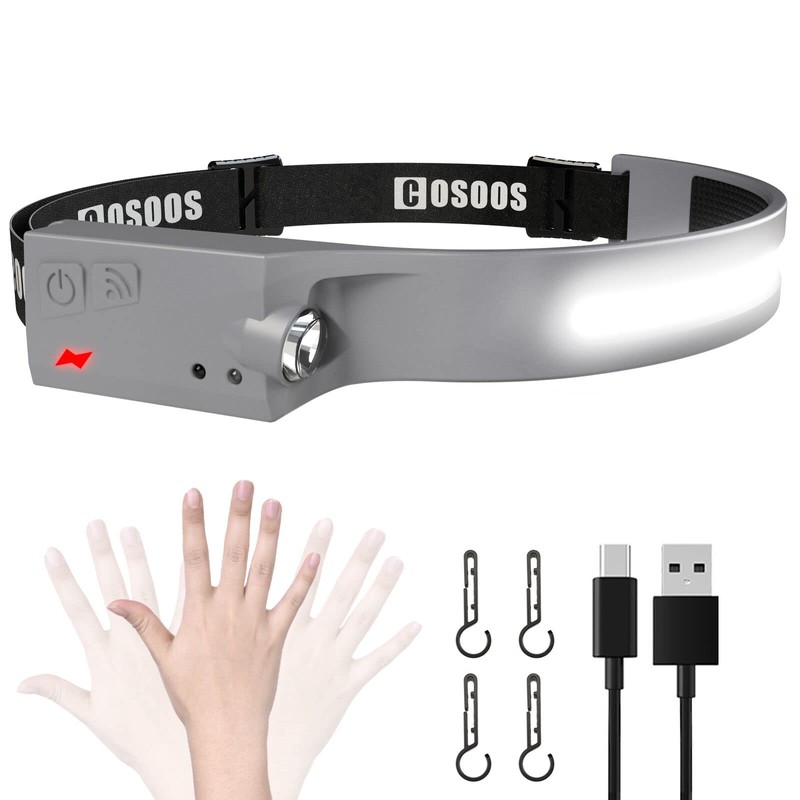 • Tecnología de detección de movimiento, luz manos libres: ahorra toneladas de batería adicional. Nuestro faro frontal de gran angular COSOOS tiene una batería de litio de 1200 mAh integrada y cárguelo con el cable de carga USB C incluido antes de usar. Elige 1 ajustes de brillo, presiona el botón del sensor y configura como detección de movimiento (la luz indicadora se vuelve amarilla de roja). Entonces puedes encender/apagar la luz agitando la mano frente a la recepción del sensor.