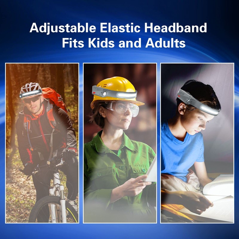• Superligera y flexible, comodidad ajustable: fácil de usar, lámpara frontal suave con banda extraíble y lavable solo pesa 70 g con batería de litio de 1200 mAh integrada. No puedes sentir nada incluso llevándolo todo el día. La circunferencia de la cabeza es de 20 a 28 pulgadas, se adapta a adultos y niños.