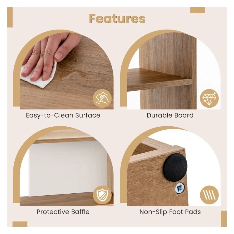● Durable Structure: Made of thickened engineered wood, this freestanding display shelf ensures a rugged and durable structure for a long lifespan. Non-slip foot pads at the bottom prevent the floor from getting damaged.