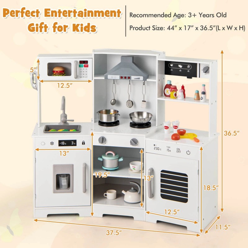 Step into a world of culinary wonder with our kids pretend play kitchen, a captivating playset that sparks creativity and endless fun for your little chef. It features a range hood that lights up and makes sounds, dual stoves with illuminating burners and cooking sounds, and rotary knobs with click sound, creating a dynamic and engaging play environment. Complete with a sink and faucet for washing, a cooking preparation area with cutting, a pot and pan for cooking, a coffee maker for drinking, a refrigerator with an ice maker, an oven, microwave, and even a telephone for taking orders, the fun and learning never stop. When not playing, this wooden cabinet can also be used for storage, keeping tidiness while offering convenient access to play accessories. Engage your child in learning and development through interactive playtime with this enriching toy.