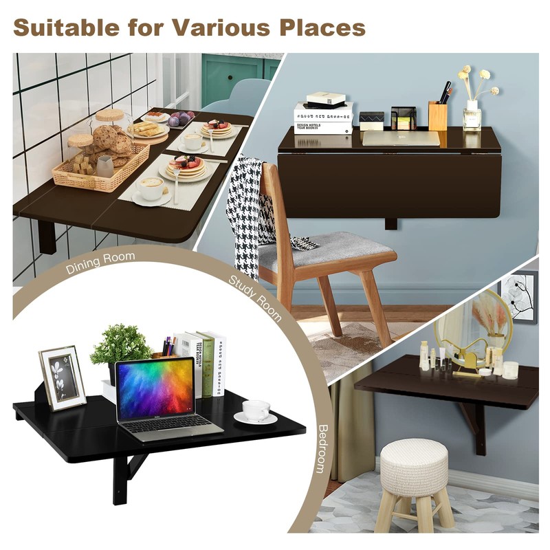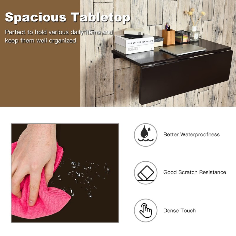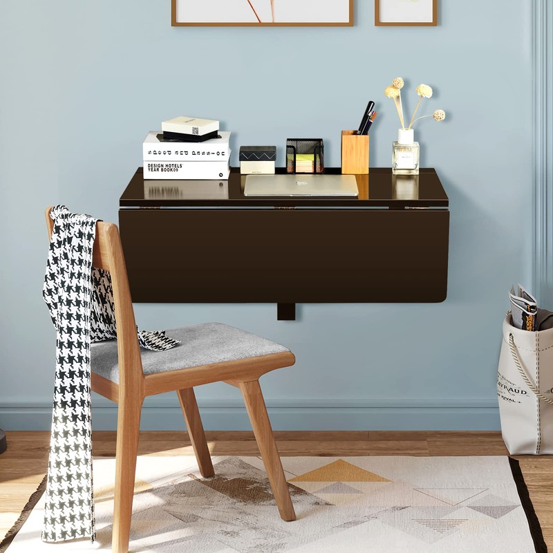 • [Special Double Folding Design:]Compared with other folding desks with just 1 fold point, this drop-leaf table with 2 ways of easy folding will bring you much more convenience. The floating desk can be completely folded on the wall when not in use and you can also fold half of the countertop when you do not have many items to put on it.