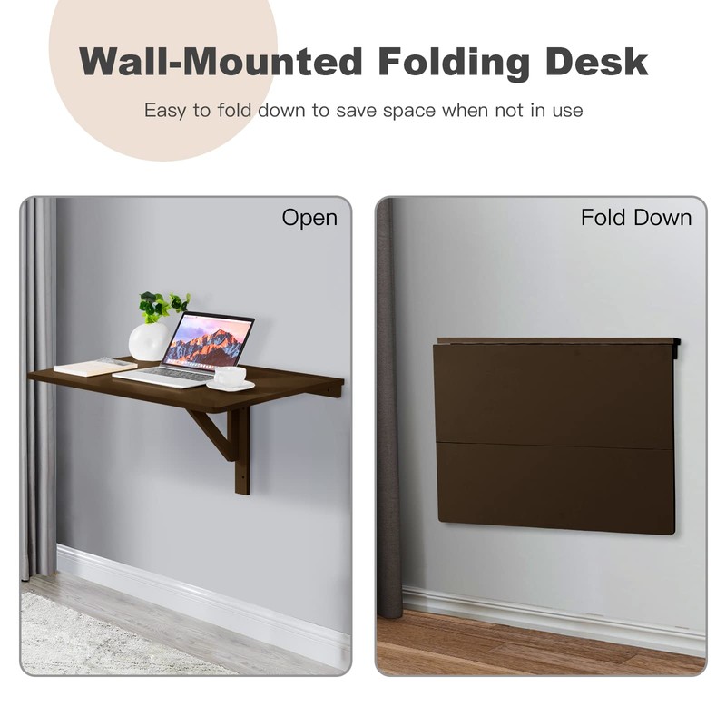 COSTWAY Wall Mounted Folding Table, 31.5" x 23.5" Drop-Leaf Floating Writing Desk for Small Spaces, Space-Saving Fold Down Laptop Workstation for Kitchen, Bedroom, Laundry Room, Study Room (Brown)